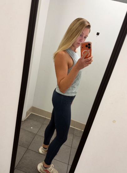 J'avais commandé la taille L auparavant et elle m'allait, mais elle est tellement extensible et jolie que j'ai eu l'impression d'avoir besoin d'un modèle encore plus ajusté pour mettre mes courbes en valeur. Je suis aussi en phase de sèche dans mon entraînement et je perds du poids, donc j'en ai tenu compte. 10/10